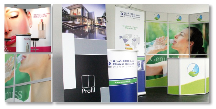 Präsentationssysteme wie Faltwand, RollUp, Theken und Flaggen gehören zum Grundausstattung einer erfolgreichen Promotion. Wir bieten Ihnen den Komplettservice von der Beratung, Gestaltung, Produktion, Konfektionierung, Einweisung und Einlagerung aller bekannten mobilen Messesysteme.